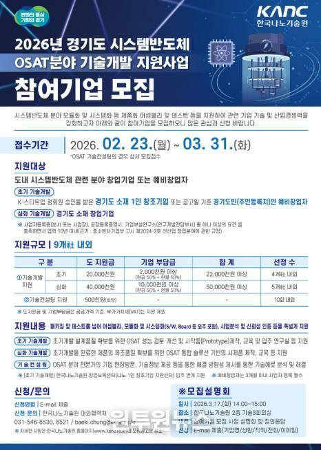 (원투원뉴스) 경기도가 시스템반도체 산업 생태계 강화를 위해 ‘2026년도 경기도 시스템반도체 후공정(OSAT) 분야 기술개발 지원사업’에 참여할 도내 예비창업자 및 창업기업을 3월 31일까지 모집한다.