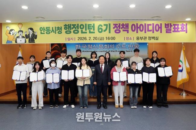 (원투원뉴스) 안동시는 2월 20일 시청 청백실에서 제6기 행정인턴 정책 아이디어 발표회를 개최하고, 두 달간의 인턴 활동을 마무리하는 시간을 가졌다. 이번 발표회는 시청 각 부서 및 유관기관에 배치돼 근무한 인턴들이 현장에서 경험한 내용을 바탕으로 정책 제안을 공유하기 위해 마련됐다.