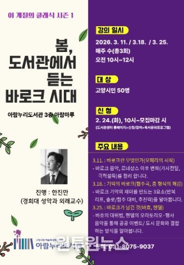 (원투원뉴스) 고양특례시 아람누리도서관은 2026년 한 해 동안 서양 음악사를 시대별로 조망하는 연간 기획 프로그램‘이 계절의 클래식’을 운영한다.