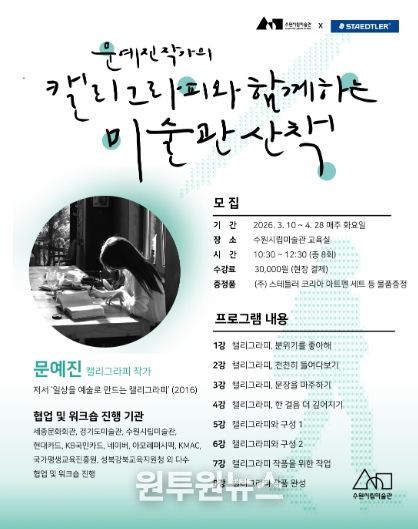 (원투원뉴스) 수원시립미술관은 독일 문구 기업 ㈜스테들러 코리아와 공동으로 '캘리그라피와 함께하는 미술관 산책'을 3월 10일부터 4월 28일까지 운영하며 참가자를 모집한다.