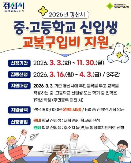 지원대상은 2026년 3월 3일 기준 경산시에 주민등록을 두고 교복을 착용하는 학교에 입학하는 신입생과 학기 중 전학온 1학년 학생이다.