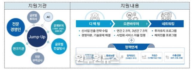 ‘점프업 프로그램’은 글로벌 중견기업 도약을 목표로 신사업 진출전략부터 경영·기술 자문, 오픈바우처, 투자유치·해외진출 네트워킹, 정책연계 등을 3년간 밀착지원 하는 사업이며, 전문경영인, 글로벌컨설팅사, 연구기관 등과 더불어 중소벤처기업진흥공단, 중소기업기술정보진흥원, 기술보증기금, 신용보증기금 등 다양한 전문기관과 협력을 통해 성장 과정에 필요한 요소를 집중 지원하는 것이 특징이다.