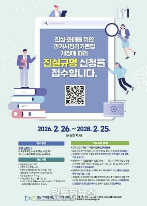 신청 기간은 2026년 2월 26일부터 2028년 2월 25일까지로 2년간 운영되며, 위원회 의결에 따라 연장될 수 있다. 신청은 신청서를 작성해 속초시청 자치행정과 또는 서울에 소재하고 있는 진실화해위원회에 직접 방문 제출하거나 우편 등을 통해 제출할 수 있다.