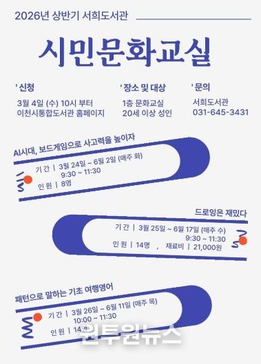 (원투원뉴스) 이천시 서희도서관이 지역 주민들의 문화적 소양을 높이고 배움의 즐거움을 나누기 위해 ‘2026년 상반기 시민문화교실’을 운영하고 성인 수강생을 모집한다고 밝혔다.