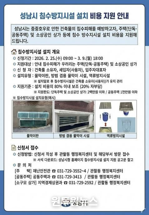 (원투원뉴스) 성남시는 여름철 집중호우로 인한 주택과 상가의 침수 피해를 사전에 예방하기 위해 침수방지시설 설치 비용을 최대 80%까지 지원한다.