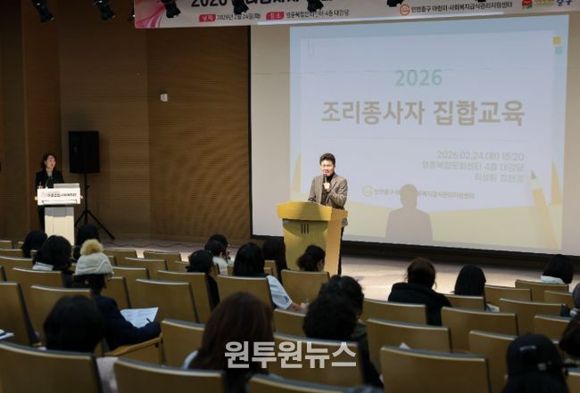 (원투원뉴스) 인천시 중구는 지난 24일 영종복합문화센터 대강당에서 ‘2026년도 어린이·사회복지급식관리지원센터 조리종사자 집합교육’을 진행했다.
