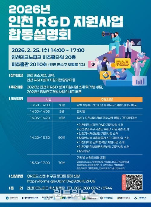 (원투원뉴스) 인천광역시는 2월 25일 인천 미추홀타워에서 관내 중소기업 및 대학 연구기관 관계자 200여 명이 참석한 가운데 '2026년 인천 R·D·지식재산 지원사업 합동설명회'를 개최했다고 밝혔다.