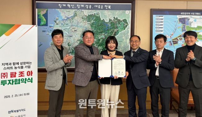 (원투원뉴스) 전북특별자치도는 25일 도청에서 익산시와 함께 농식품 가공 선도기업 ㈜팜조아와 투자협약(MOU)을 체결하고, 익산 제4산업단지 증설 투자에 대한 본격적인 지원에 나섰다.