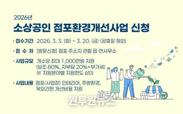 (원투원뉴스) 충북 영동군은 어려운 경제 여건 속에서 경영에 어려움을 겪는 관내 소상공인의 사업 경쟁력 확보와 자생력 강화를 위해 '2026년 소상공인 점포환경개선사업'을 시행한다고 밝혔다.