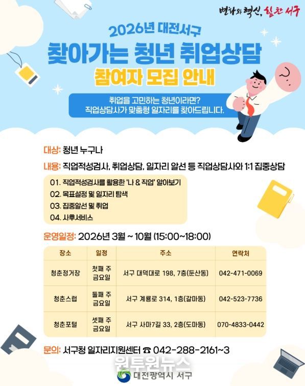 (원투원뉴스) 대전 서구 일자리지원센터는 청년들의 취업 고민 해소와 실질적인 일자리 연계를 위해 올해 3월부터 10월까지 ‘찾아가는 청년 취업 상담’을 운영한다.