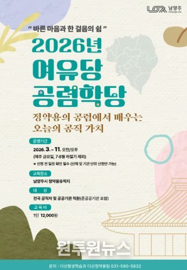 (원투원뉴스) 남양주시는 정약용유적지 일원에서 전국 공직자와 공공기관 직원을 대상으로 ‘2026년 상반기 여유당 공렴학당’ 교육생을 모집한다고 26일 밝혔다.