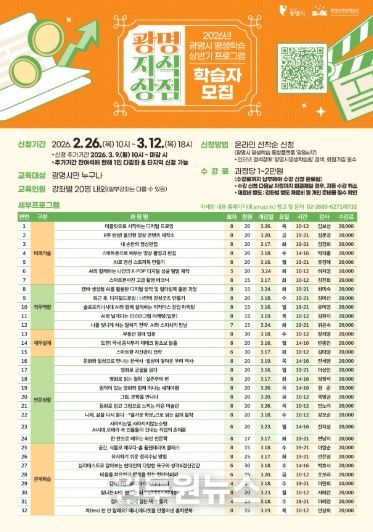 (원투원뉴스) 광명시 평생학습원은 26일부터 시민 맞춤형 평생학습 프로그램인 ‘광명지식상점’ 2026년 상반기 학습자 700여 명을 모집한다.