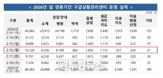 (원투원뉴스) 소방청은 2026년 설 연휴 기간(2.14.~2.18., 5일간)전국 총 45,082건의 구급 출동으로 24,166명을 이송하였으며, 구급상황관리센터에서 총 42,062건의 상담을 실시했다고 밝혔다.