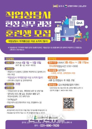 (원투원뉴스) 김포여성새로일하기센터는 고용서비스의 질적 향상과 경력단절 예방을 위해 '직업상담사 현장실무 과정' 훈련생을 모집한다.
