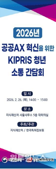 (원투원뉴스) 지식재산처는 2월 26일 14시, 한국지식재산센터(서울 강남구)에서 청년들의 참신한 시각을 통해 지식재산정보검색서비스(KIPRIS)의 발전 방향을 모색하는 'KIPRIS 청년 소통 간담회'를 개최한다고 밝혔다.