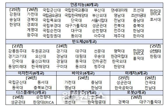2026년에는 피지컬 인공지능(Physical AI) 시대, 중요성이 증대되고 있는 로봇 분야 2개교, 미래차 2개교를 선정했다. 또한 인공지능(AI) 분야 37개교는 지역별로 기업 수요에 기반한 인공지능(AI) 인재가 양성될 수 있도록, 비수도권 30개교(대경권 6개교, 동남권 6개교, 충청권 6개교, 호남권 6개교 및 강원·전북·제주 6개교), 수도권 7개교(서울 3개교, 경기·인천 4개교) 등 권역별로 선정했다.