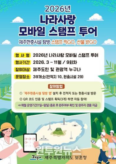 (원투원뉴스) 제주특별자치도 보훈청은 오는 3월부터 11월까지 모바일 앱을 활용해 도민과 관광객 누구나 참여할 수 있는 ‘2026 나라사랑 모바일 스탬프 투어’를 운영한다고 밝혔다.
