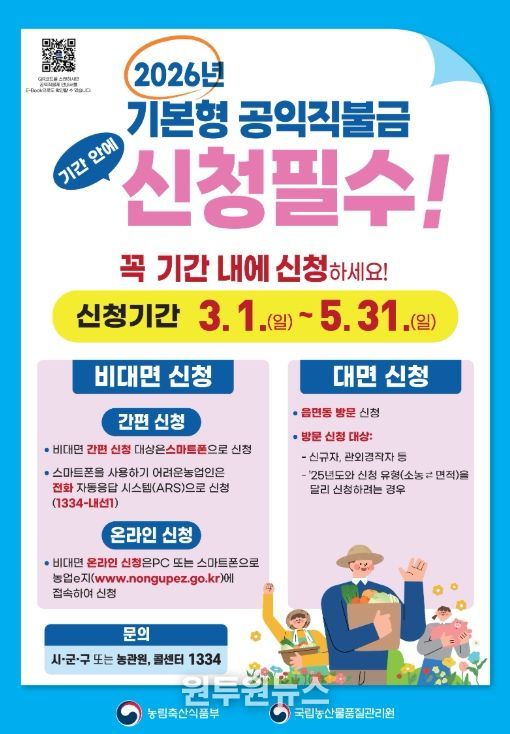 (원투원뉴스) 공주시는 오는 3월 1일부터 ‘2026년 기본형 공익직불금’ 신청을 받는다고 27일 밝혔다.