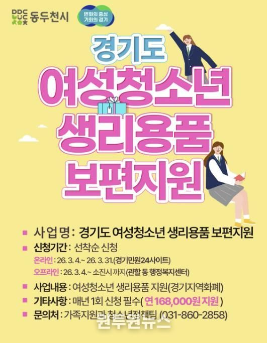 (원투원뉴스) 동두천시는 2026년 ‘경기도 여성청소년 생리용품 보편 지원사업’과 관련해 여성청소년의 건강한 성장 지원을 위해 경기지역화폐 신청을 받는다고 밝혔다.