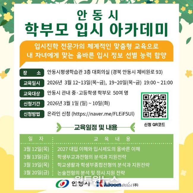 안동시 관계자는 “입시는 장기적인 준비가 필요한 만큼 학부모의 이해와 역할이 매우 중요하다”며 “이번 아카데미가 자녀의 미래 설계를 위한 든든한 길잡이가 되길 기대한다”고 밝혔다.