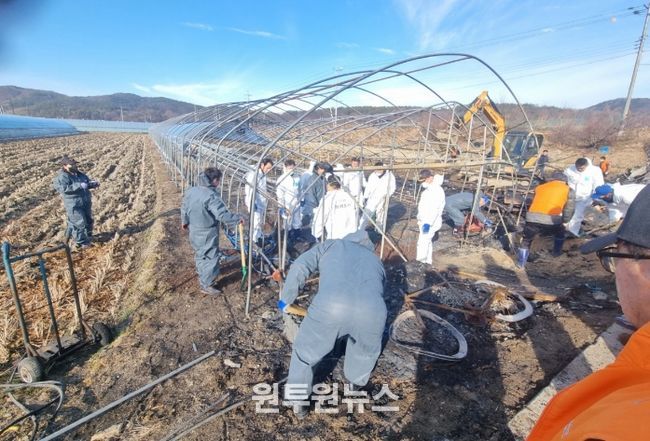 이달 7일 발생한 해당 사고로 인명피해는 없었으나, 비닐하우스와 내부 가재도구와 적재물이 소실되어 화재 잔해와 폐기물이 상당했다.