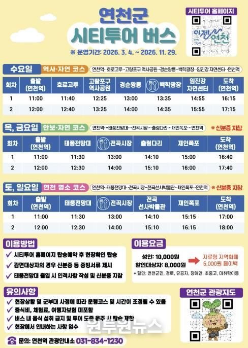 (원투원뉴스) 연천군이 오는 3월 4일부터 ‘2026년 연천 시티투어 버스’를 재운행한다. 운영 기간은 11월 29일까지다.