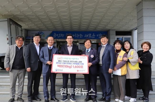 (원투원뉴스) 예수그리스도 후기 성도 교회와 대한적십자사 경상북도지사가 지난해 3월 발생한 경북산불의 피해로 어려움을 겪고 있는 영덕군 이재민들을 위해 지난 25일 6,400만 원 상당의 10kg 들이 쌀 1,600포를 기부하는 전달식을 가졌다.