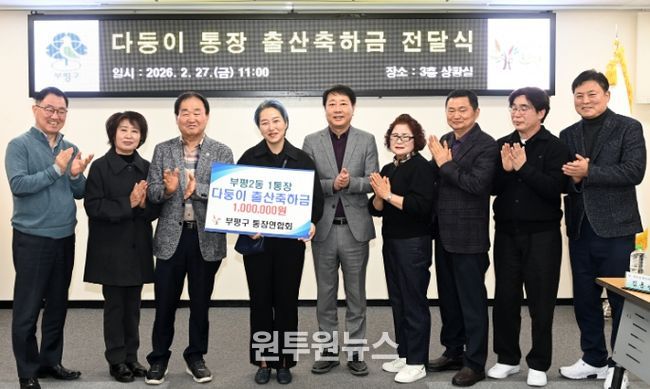 박영택 통장연합회 회장은 “부평구 주민이자 통장인 분이 다둥이를 출산했다는 기쁜 소식을 듣고 회원들이 한마음으로 축하의 뜻을 모았다”고 말했다.