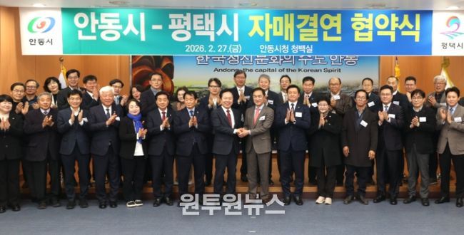 (원투원뉴스) 평택시의회는 2월 27일, 안동시청에서 평택시-안동시 자매결연 협약식에 참석해 양 도시의 상생 발전을 다짐했다.