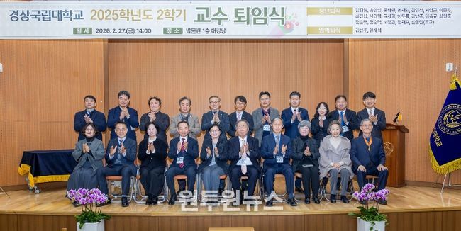 (원투원뉴스) 경상국립대학교는 2월 27일 오후 2시 가좌캠퍼스 박물관 1층 대강당에서 2025학년도 2학기 교수 퇴임식을 개최했다. 교수 퇴임식은 후학양성과 대학발전을 위해 커다란 발자취를 남기고 정년을 맞아 퇴직하는 교수들의 공로를 기리기 위해 마련됐다.