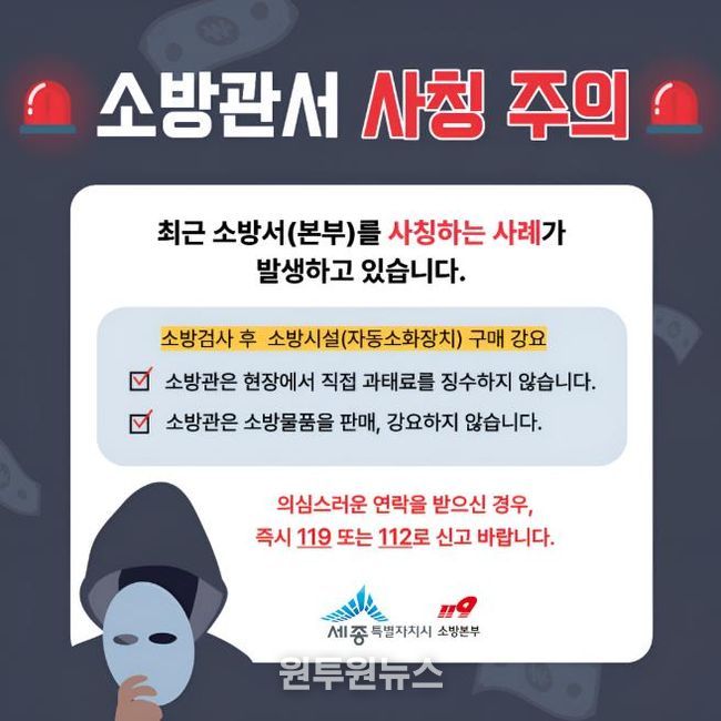 (원투원뉴스) 최근 세종소방본부를 사칭해 소방용품 구매를 강요하는 사기 시도가 잇따르고 있어 시민들의 각별한 주의가 요구된다.