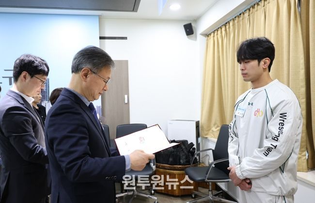 (원투원뉴스) 구로구는 3월 6일 오전 11시 구청 르네상스홀에서 ‘구로구청 직장운동경기부 신규 선수 입단식’을 열고 2026년 신규 임용된 레슬링팀 선수 3명과 배드민턴팀 감독·코치 및 선수 6명을 공식 소개했다.
