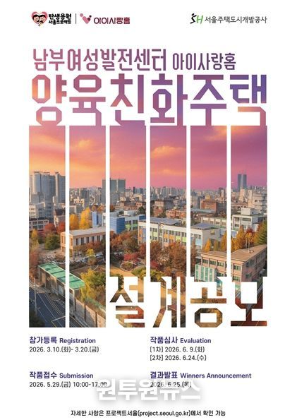 이와 관련해 사업시행자인 서울주택도시개발공사(SH)는 ‘양육친화주택 아이사랑홈’ 2호의 창의적인 설계안 마련을 위한 설계공모를 실시한다. 설계공모는 서울시 설계공모 누리집에서 오는 10일 공고되며, 3월 20일까지 참가등록을 받는다.