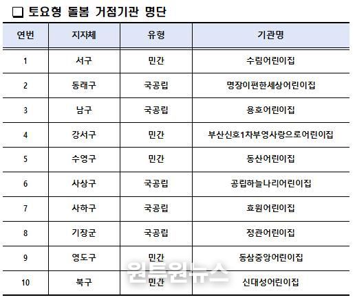 부산교육청은 부산시와 협력하여 지역 간 돌봄 접근성 격차를 완화하기 위해 부산시 ‘부산형 365 열린 시간제 어린이집’미운영 8개 자치구 중 공모 신청한 6개 자치구 내 어린이집을 ‘토요형 돌봄 거점기관’으로 우선 선정했다.