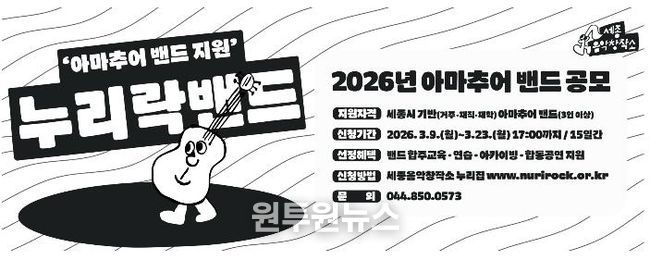 (원투원뉴스) 세종시문화관광재단은 오는 3월 23일까지 ‘2026년 누리락밴드’ 사업에 참여할 지역 아마추어 밴드를 모집한다.
