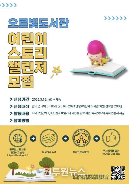 (원투원뉴스) 동두천시 도서문화사업소는 3월 16일부터 관내 5-10세 어린이를 대상으로 ‘어린이 스토리 챌린저’ 참여자를 모집한다고 밝혔다. 이번 사업은 어린이의 자발적인 독서 습관 형성과 ‘책 읽는 동두천’ 분위기 조성 및 독서문화 확산을 위해 마련했다.