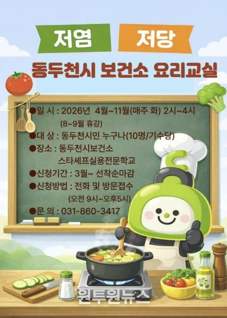 (원투원뉴스) 동두천시보건소는 2026년 만성질환 관리 및 예방을 위한 ‘저염·저당 식단 요리 프로그램’ 참여자 60명(매월 10명씩)을 선착순 모집한다고 밝혔다.