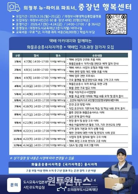(원투원뉴스) (재)의정부도시교육재단은 택배 전문 교육기관 택배아카데미와 협력하여, 중장년층의 새로운 도전을 지원하는'화물운송종사자격증+택배업 기초과정'참여자를 3월16일부터 모집한다고 밝혔다.