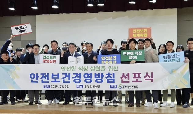 (원투원뉴스) 군포산업진흥원은 지난 9일 청사 3층 컨벤션홀에서 기관 임직원이 참석한 가운데 '2026년 안전보건경영 선포식'을 개최했다.