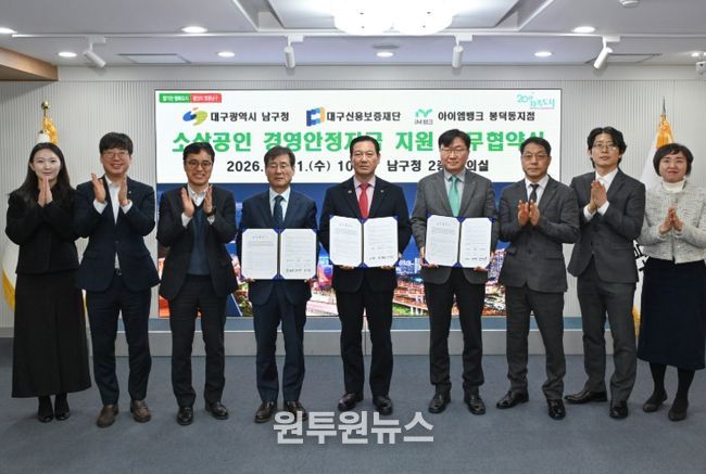 (원투원뉴스) 대구 남구는 11일 지역 소상공인들의 경영난 해소를 위해 대구신용보증재단 및 아이엠뱅크 봉덕동지점과 소상공인 경영안정자금 지원 업무협약을 체결했다.