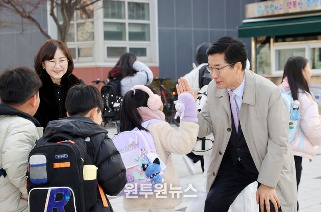 (원투원뉴스) 윤건영 충청북도교육감은 11일(수), 증안초등학교(교장 김백락)를 방문해 등교하는 학생들을 맞이하며 새학기 출발을 응원하고, 다채움 기초학력 진단검사 운영 상황을 점검했다.