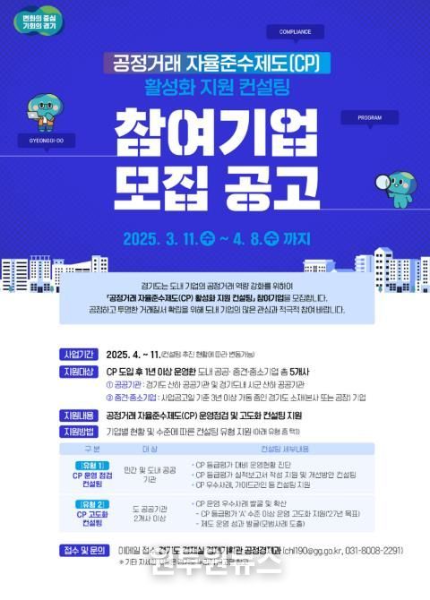 서봉자 경기도 공정경제과장은 “그동안 경기도는 도내 CP 도입 기반 마련에 중점을 두고 지원해 왔다”며 “앞으로는 제도의 실효성을 높이고 우수 사례 확산을 통해 기업의 자율적 준법경영 문화가 자리 잡도록 지속적으로 지원하겠다”고 말했다.