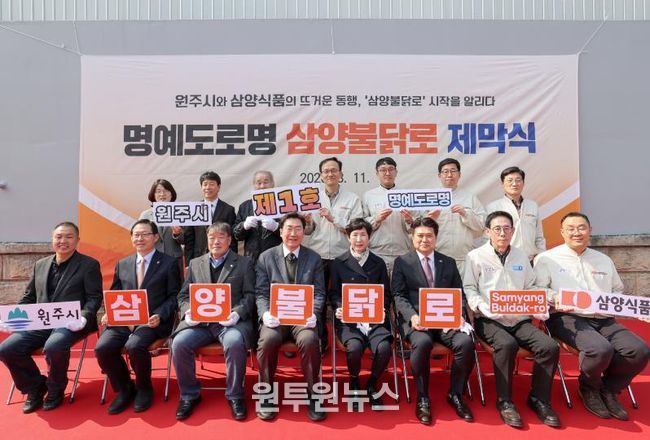 (원투원뉴스) 원주시는 지난 11일 우산동 삼양식품 원주공장 인근에서 원주시 제1호 명예도로명인 ‘삼양불닭로’ 제막식을 열었다. 이날 행사에는 원강수 시장과 김정수 삼양식품 부회장, 김동찬 삼양식품 대표 등 관계자 30여 명이 참석했다.