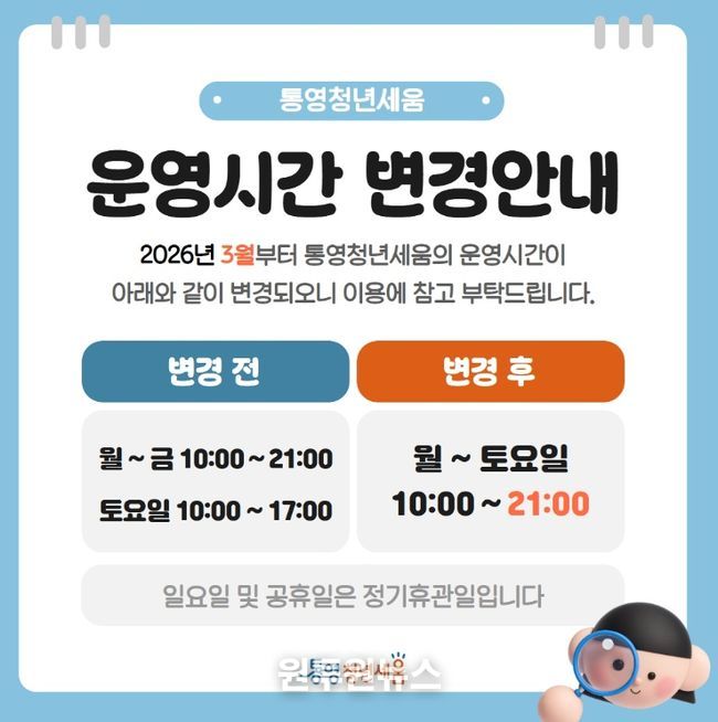 (원투원뉴스) 통영시 청년센터(청년세움)는 청년들의 자유로운 소통과 역량 강화를 위해 2026년 3월부터 운영 시간을 대폭 확대하고 야간 이용 환경을 개선했다고 12일 밝혔다.