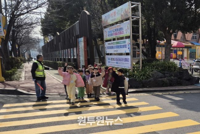 (원투원뉴스) 제주도교육청 봉개초등학교병설유치원은 10일 신학기를 맞아 유아들을 대상으로 실제 횡단보도를 건너보는 교통안전 체험교육을 실시했다.