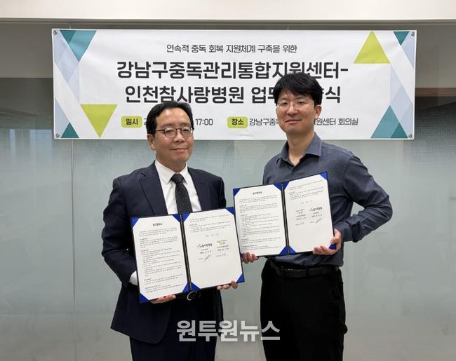 (원투원뉴스) 꿈이 모이는 도시, 미래를 그리는 강남구가 마약류 중독 등 중독 문제에 보다 전문적으로 대응하기 위해 인천참사랑병원과 치료·재활 협력체계를 구축했다. 강남구중독관리통합지원센터와 인천참사랑병원은 지난 3월 11일 강남구중독관리통합지원센터(강남구 보건소 5층)에서 업무협약을 체결하고, 중독 치료부터 지역사회 재활까지 이어지는 연속적인 지원체계를 마련하기로 했다.