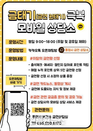 차현수 보건소장은 “금연은 결심보다 유지가 더 힘든 과정인 만큼, 언제 어디서든 전문가의 도움을 받을 수 있는 모바일 상담 서비스가 큰 힘이 될 것”이라며 “앞으로도 시민들의 건강한 삶을 위해 담배 연기 없는 통영을 만드는 데 최선을 다하겠다”고 전했다.