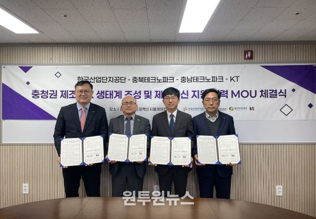 (원투원뉴스) (재)충북테크노파크 스마트제조혁신센터가 12일 충북청주 공정혁신시뮬레이션센터 중회의실에서 한국산업단지공단, 충남테크노파크, KT와 ‘충청권 제조 AX 생태계 조성과 제조혁신 지원 협력을 위한 업무협약(MOU)’을 체결했다고 밝혔다.