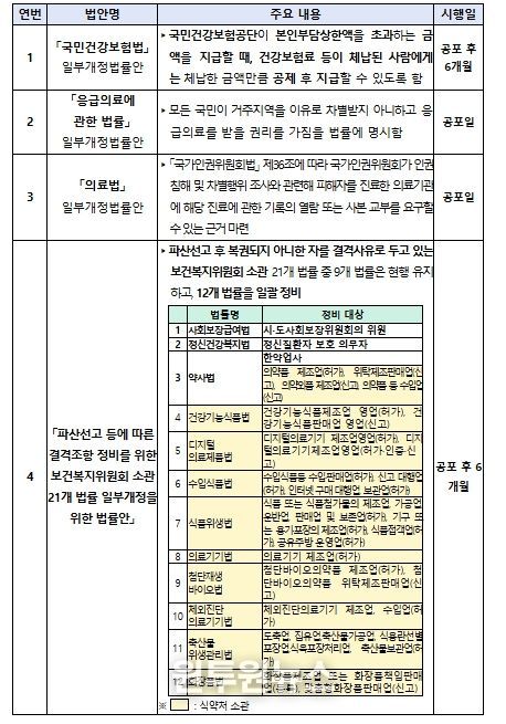 (원투원뉴스) 보건복지부는 3월 12일 제433회 국회(임시회) 본회의에서 '국민건강보험법'·'응급의료에 관한 법률'·'의료법' 일부개정법률안, '파산선고 등에 따른 결격조항 정비를 위한 보건복지위원회 소관 21개 법률 일부개정을 위한 법률안' 등 보건복지부 소관 4개 법률안이 의결됐다고 밝혔다.