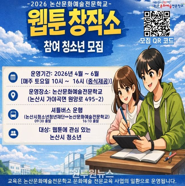 (원투원뉴스) 논산시가 지역 청소년들에게 전문적인 문화예술 창작 교육 기회를 제공하고, 지역의 교육 기반을 확대하기 위해 ‘2026년 논산문화예술전문학교 웹툰창작소’ 교육과정을 확대 운영한다.